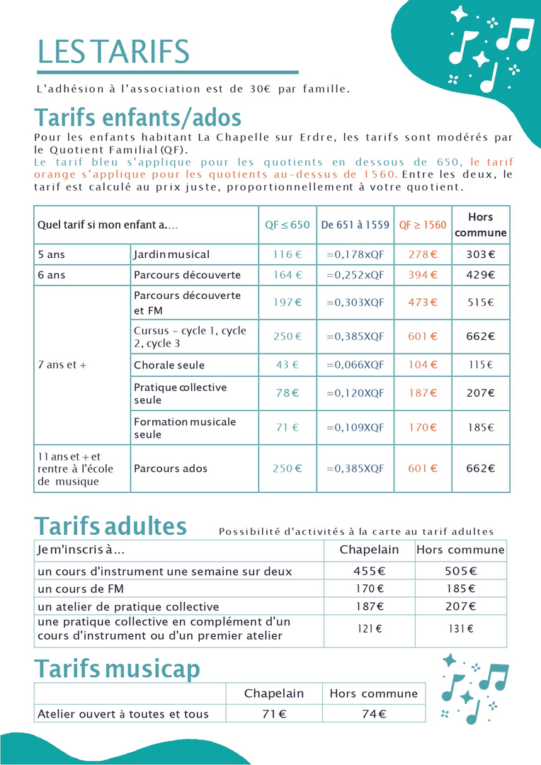 Les inscriptions se font en ligne. Avant de commencer votre démarche, nous vous conseillons de lire les documents ci-dessous. Vous trouverez un document présentant l'école de musique, les tarifs, les jours et heures des pratiques collectives et des cours de FM, les jours de présence de professeurs et une note pour les parcours découverte et première année.