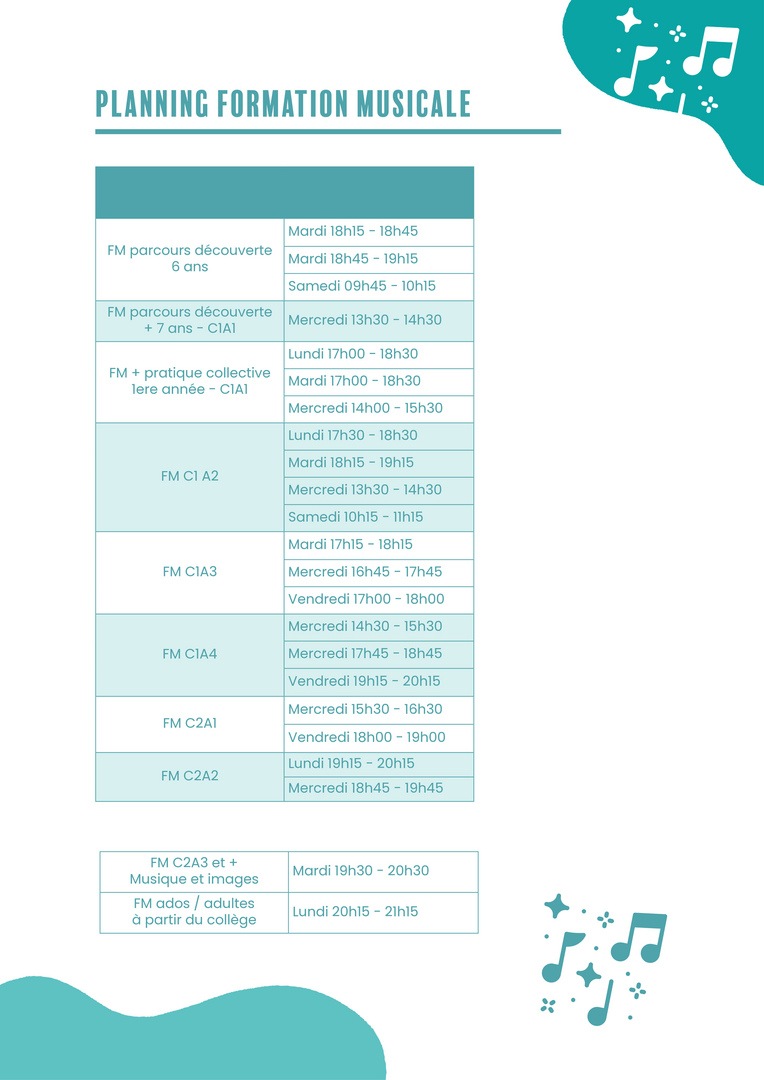Vous trouverez ci-dessous un tableau récapitulatif des cours de FM et des pratiques collectives.